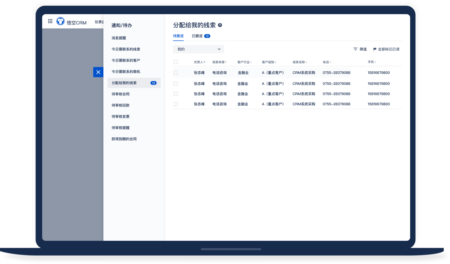 以企業財務管理人員為主,提供全面財務管理功能。無縫對接悟空CRM系統,實現客戶-銷售-庫存-財務一體化智能管理。